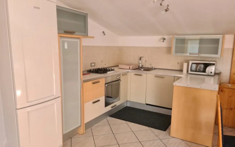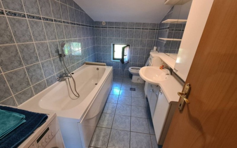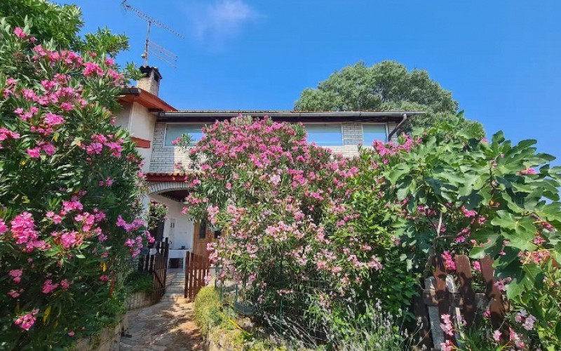 The apartment, surrounded by oleanders, is located on the upper floor of an apartment building. It offers a large terrace with comfortable seating and a beautiful view of nature, a well-equipped kitchen with a dining area, a living room with a sofa, a TV and the option of heating with a fireplace, a bathroom with a bathtub and a washing machine, and two bedrooms.