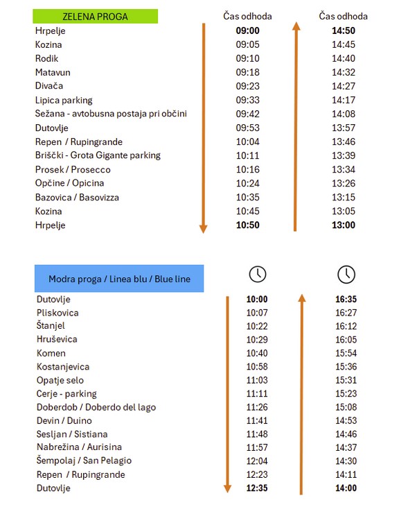 On the Green Route, the van will start from Hrpelje at 9:00 in the morning and 13:00 in the afternoon.