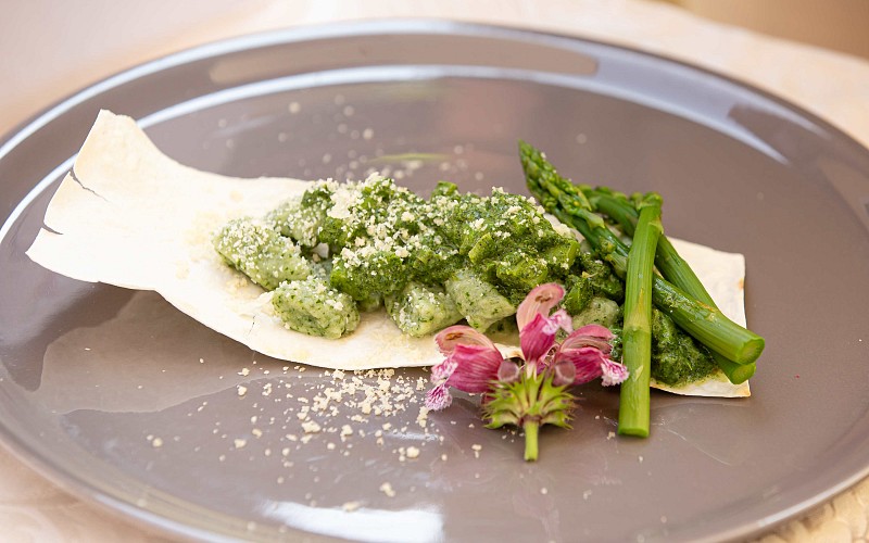 Špargljevi njoki s špargljevo kremo in praženimi lešniki